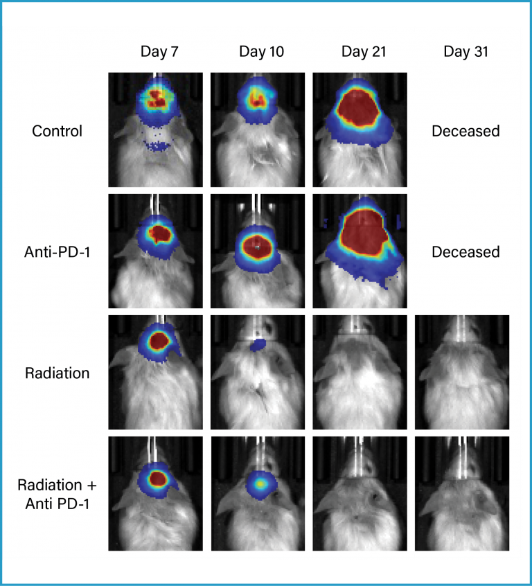 Como medio para utilizar la tecnología en un experimento de prueba de concepto, se implantó la línea tumoral de linfoma de células B de ratón A20 en el flanco bilateralmente en ratones inmunocompetentes. El tumor del lado derecho se trató específicamente con un programa de dosificación fraccionado y focalizado de 2 Gy cinco días a la semana durante dos ciclos. En este programa de dosis y duración, comenzamos a ver inhibición del crecimiento en los tumores tratados. Los tumores contralaterales en los mismos ratones no se vieron afectados por el tratamiento de radiación y coincidieron con el control del vehículo. Este tipo de diseño de estudio es fácilmente modificable para adaptarse a dosis de radiación mucho más altas realizadas en un período de tiempo menos frecuente. Para validar esta línea celular de glioblastoma de ratón, GL-261-Luc se implantó intracranealmente en ratones inmunocompetentes. Se administró una dosis alta única de 10 o 15 Gy específicamente al cerebro y se utilizaron imágenes de bioluminiscencia para monitorear la progresión de la enfermedad a lo largo del tiempo. Se encontró que mientras que una dosis única de 10 Gy dio lugar a una supervivencia general del 25%, una dosis única de 15 Gy dio lugar a una supervivencia a largo plazo del 100%.